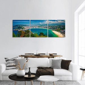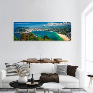 Photographic panoramic print of a coastal city and bay, showing a sandy beach, boats on the water, and buildings along the shore. Bright blues, greens, whites, and tans create a vibrant, sunny, expansive mood that suits coastal or modern living spaces.