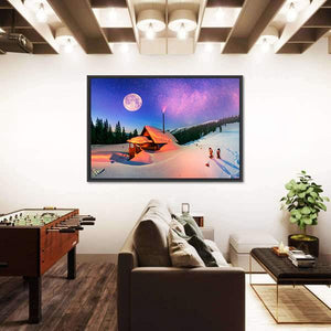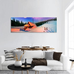 A photorealistic panoramic view of a Carpathian cabin beneath snowy mountains and a star-filled night sky in Montenegro. Soft blues, pinks and oranges with visible chimney smoke create a serene, magical, cozy winter atmosphere, suited to modern or cozy interiors.