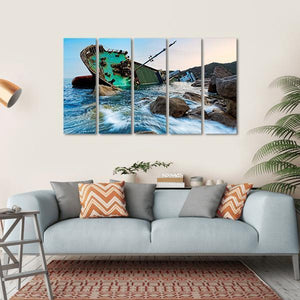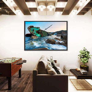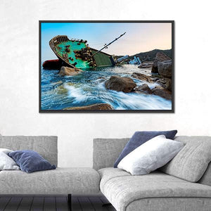 This poignant artwork features a rusted green shipwreck against a turbulent ocean backdrop, capturing a sense of melancholy and drama. The deep shades of blue and green evoke the raw beauty of nature, making it a striking piece for any space.