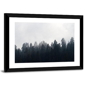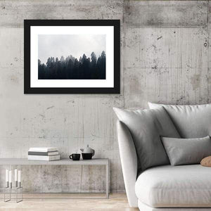 Silhouette of redwood trees rises from mist in a low-angle, photorealistic view that highlights dark green, gray, and white tones. The dramatic, serene image feels mysterious and moody, a quiet focal point for modern interiors or nature-themed rooms.
