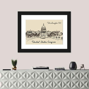 Hand-drawn sketch of the United States Capital focused on its distinctive dome, columns, and steps. Rendered in beige, black, and white, this panoramic canvas carries a formal, majestic, historical mood. It suits formal spaces such as studies, offices, or entryways and complements architecture-focused or classic decor.