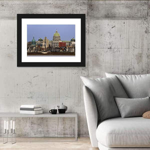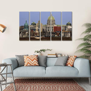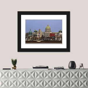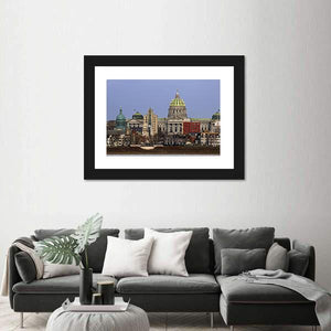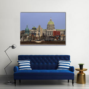 This canvas art features a captivating view of the State Capitol Complex, showcasing multiple domed buildings and a serene riverfront. With a palette of blue, green, and red, it evokes a grand and historic urban atmosphere that can enhance any space.