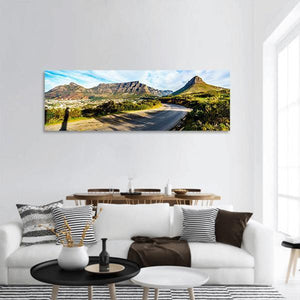 Sun Setting Over Cape Town captures a realistic panoramic landscape of mountains, a winding road, trees and a small town beneath a late-day sky. The scene feels expansive and travel-minded, with greens, blues and muted greys and a subtle shadow of a person on the road; it fits modern living rooms, offices, or hallways that favor contemporary canvas art.