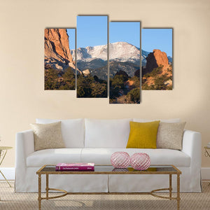 Sunrise Over Pikes Peak in Colorado shows rock formations and pine trees framing a snow-dusted mountain, lit by warm orange sunlight. The realistic landscape feels majestic and serene, with a palette of orange, white, green and blue. It works well in modern or nature-themed rooms seeking a calm focal piece.