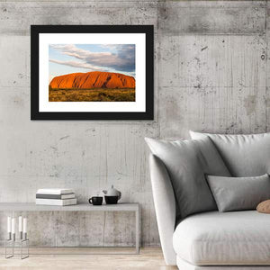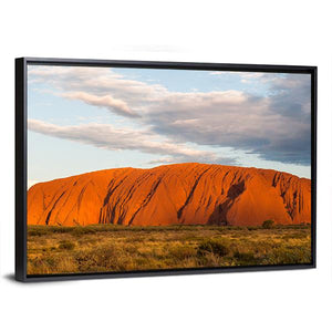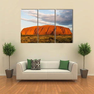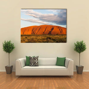 This photorealistic landscape shows Uluru (Ayers Rock) lit by sunset, with warm orange and brown tones highlighting striations on the rock face. Tall grass and scrub in the foreground and a cloud-streaked sky create a serene, grand atmosphere that suits modern or natural-themed room decor.