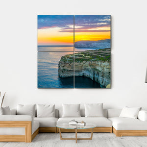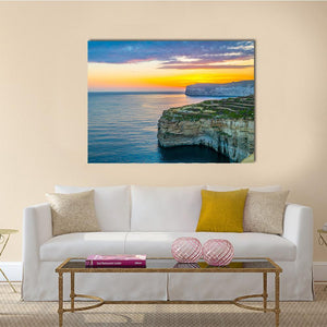 Experience the serene beauty of coastal cliffs and the tranquil ocean in this captivating canvas art. The striking sunset colors of orange and yellow blend harmoniously with shades of blue, creating a peaceful atmosphere perfect for any nature lover.