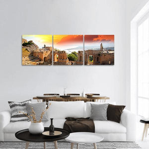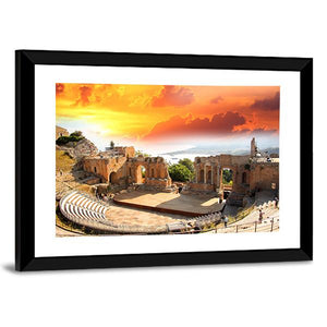 This panoramic canvas shows the ancient theater of Taormina in Sicily, with stone arches and columns framed by a dramatic Mediterranean sunset and distant coastline. Its realistic, cinematic palette of warm oranges, browns and blue-gray tones creates an epic, nostalgic mood that fits modern or coastal interiors.