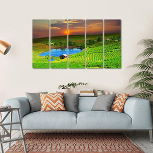 Capture the serene beauty of Vietnam's tea plantations with this vibrant canvas art. Featuring rows of lush crops against a tranquil lake, it evokes a peaceful ambiance reminiscent of a golden hour sunset.