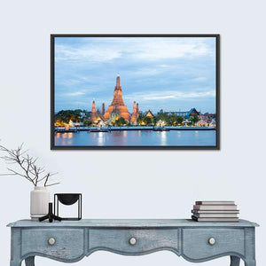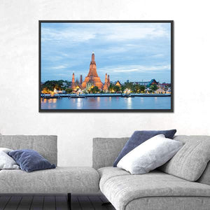 A panoramic canvas featuring the Bangkok skyline with Wat Arun along the Chao Phraya River, captured at dusk. The realistic scene uses blue and orange tones to convey a serene, majestic, and historic mood, with the temple softly illuminated and calm river reflections. Fits modern rooms and complements room decor that favors peaceful cityscape art.