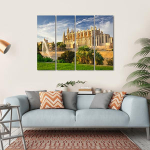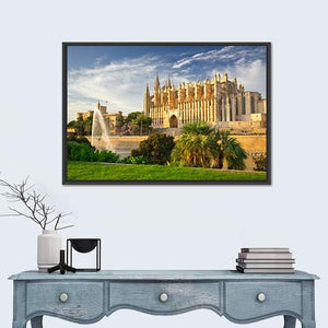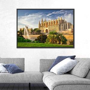 This photorealistic artwork captures the grandeur of Palma Cathedral, showcasing its ornate architecture set against a serene landscape of palm trees and lush grass. The calming palette of blue, green, and tan evokes a historic atmosphere, making it a lovely addition to any wall decor.