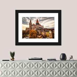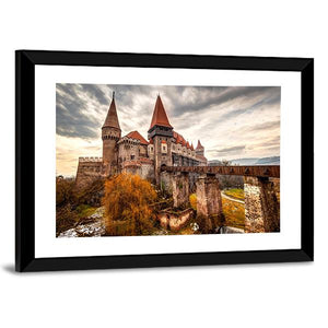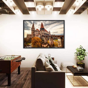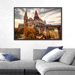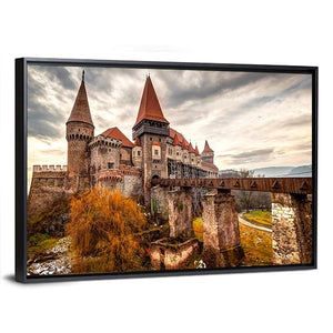 This canvas art captures the striking beauty of Corvinesti Castle in Romania, amidst an atmospheric backdrop featuring autumn foliage, a stone bridge, and an overcast sky. The historic and dramatic scene evokes a sense of wonder and storytelling.