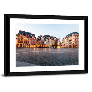 Old Town Of Mainz Panoramic Canvas presents a photorealistic, wide-angle view of European city buildings and a town square in Mainz at dusk. Warm neutrals and golden light create a nostalgic, lively, and elegant atmosphere, with buildings lit up and reflections on wet pavement. The panoramic scene suits living rooms or hallways and complements modern or classic room decor.