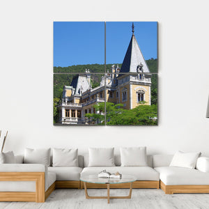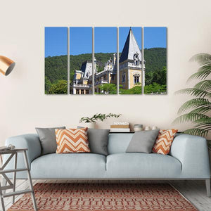 Experience the grandeur of the Massandra Palace, a stunning historic building framed by vibrant trees and majestic mountains. This picturesque canvas art captures a realistic view of colonial architecture in a rich palette of yellows, greens, blues, and grays, perfect for adding a touch of elegance to your space.