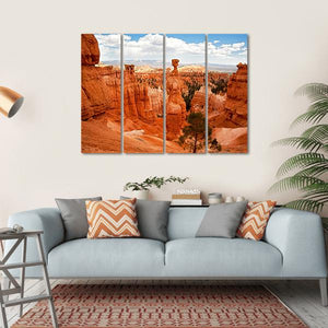 This canvas art features the majestic hoodoos of Bryce Canyon, showcasing tall orange rock formations against a serene sky adorned with clouds. The realistic style captures the awe-inspiring beauty of this unique landscape, making it a striking addition to any décor.