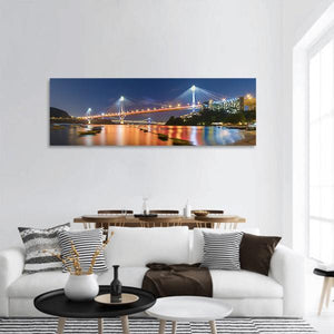 Panoramic night view of the Ting Kau Bridge with illuminated suspension cables, a distant city skyline, boats, and reflections on the water. Rich blues, oranges, and yellows render a vibrant, energetic urban atmosphere in a modern photorealistic style. Suited to contemporary living rooms and modern interiors as striking wall decor.