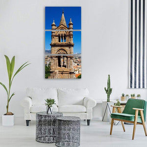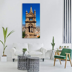 A realistic cityscape of a cathedral tower and nearby rooftops in Italy, rendered in blue, brown, white and orange tones. Ornate stonework, pointed arches and soaring spires create a historic, grand mood that suits living rooms or entryways and pairs with classic or modern interiors.