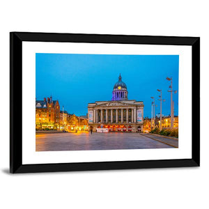 This canvas wall art captures the majestic Town Hall in Nottingham, showcasing its classical architecture under the evening sky. The composition features a lively city scene with street lights and people, inviting warmth and charm into any space.