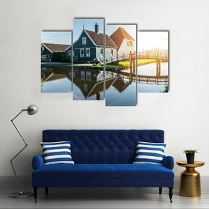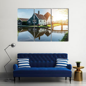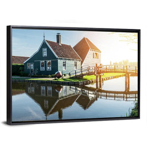 Traditional Dutch House Canvas Wall Art captures a peaceful daytime canal scene with Dutch houses, a bridge, windmills and water reflections. Its calm blue, green and brown palette and rustic‑vintage style suit room decor that favors old‑world charm.