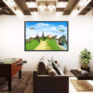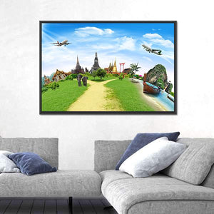 This panoramic canvas captures Thailand’s temples, elephants, boats, rock formations and a passing airplane in a vibrant, miniature-style collage. The green, blue, gold and white palette gives an adventurous, exotic daytime feel that works well in modern or travel-themed rooms.