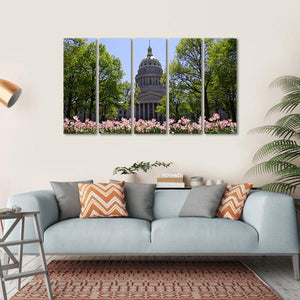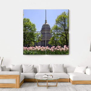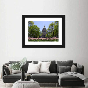 This vibrant canvas features a serene tulip garden in front of a classical government building with a prominent dome. Beautifully captured in greens, pinks, and whites, it brings a bright and majestic mood to any space.