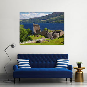 This canvas print features the serene ruins of Urquhart Castle overlooking the tranquil waters of Loch Ness, set against rolling hills. The artwork captures a historic feeling with a rustic charm, making it a beautiful addition to your wall decor.