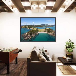 Urupukapuka Island in New Zealand stretches across this panoramic canvas, with a rocky shoreline, grassy hills, and calm turquoise water. The blue, green, tan and brown palette creates a serene, natural feel that suits coastal or modern room decor.