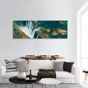 Victoria Falls in Zimbabwe is captured in a wide aerial nature photograph that highlights the powerful waterfall, rushing river, and surrounding rocks and lush vegetation. Mist rising from the falls and sunlight reflecting on water and rocks give the image a vibrant, natural energy, suitable for living rooms, entryways, or offices with a nature-focused aesthetic.