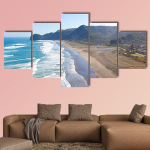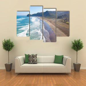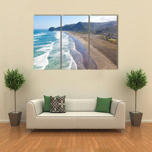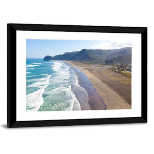 View At Piha Beach shows an aerial coastal scene with crashing waves, a sandy beach and distant hills under natural daylight. The realistic nature-photography style uses blues, greens and browns to create a serene, vast feeling. It works well as calming wall decor in coastal or modern rooms.