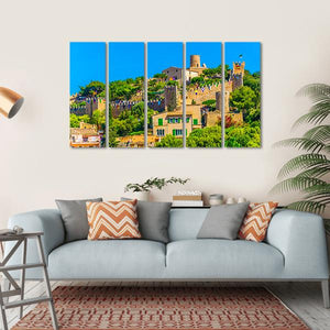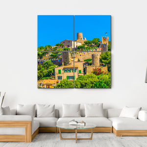This canvas art features the historic Capdepera Castle surrounded by scenic buildings, trees, and a clear blue sky. The sunny atmosphere and realistic style capture the charm of this beautiful Spanish landscape.