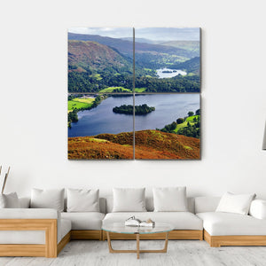 This canvas art captures a serene view of Grasmere, showcasing a tranquil lake surrounded by green fields, hills, and distant mountains. The aerial perspective highlights the beauty of nature, making it a perfect addition to your wall decor.