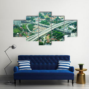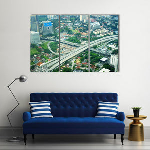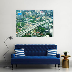 This canvas wall art captures the bustling cityscape of Kuala Lumpur, featuring a complex interplay of elevated roadways and tall buildings. The vibrant palette of green, gray, blue, and white evokes a modern and busy atmosphere, making it a striking addition to any decor.