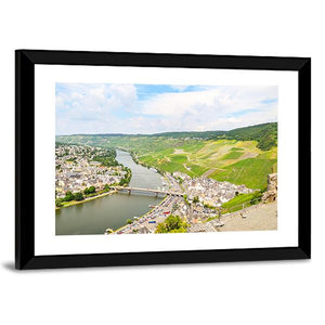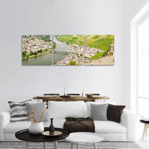 A panoramic photographic canvas of the Moselle Valley in Germany showing the river, a town with red roofs, a bridge, and terraced vineyards from an aerial view. The realistic image feels peaceful and expansive and works well on living room or dining room walls with modern or nature-focused décor.