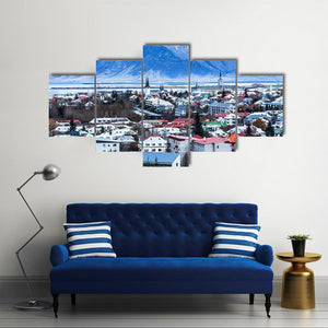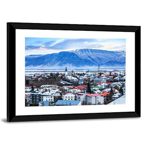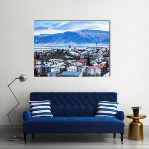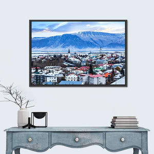 This realistic canvas art captures the serene cityscape of Reykjavik, showcasing colorful rooftops set against vast snow-capped mountains and a tranquil sky. Ideal for bringing a touch of Icelandic beauty to your space.