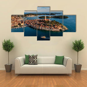 Aerial view of Rovinj’s coastal town at sunset, featuring red-tiled roofs, a white church tower and boats in the harbor. The photorealistic print captures a serene, sunlit palette of blues and warm oranges, a picturesque choice for coastal or modern room decor.