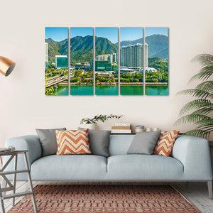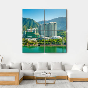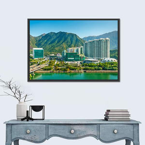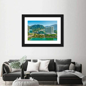 This canvas wall art captures a stunning view of Tung Chung District in Hong Kong, featuring modern high-rise buildings framed by green mountains and a sparkling teal waterfront. The bright and peaceful atmosphere is enhanced by a clear blue sky, making it a perfect addition to contemporary décor.