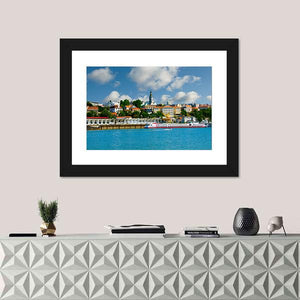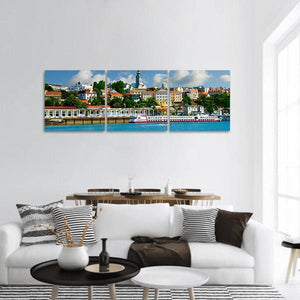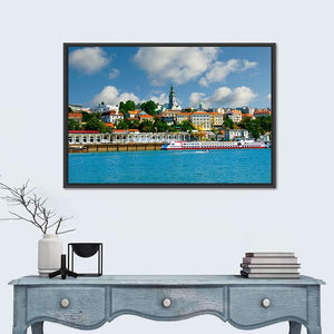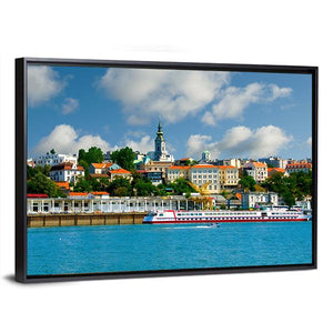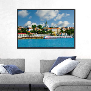 A panoramic, photorealistic view of the Orthodox church along the River Sava, featuring a lively city skyline, river, and boats. The blue-and-white palette with warm accents gives a vibrant, sunny feeling that fits city-inspired rooms and wall decor.