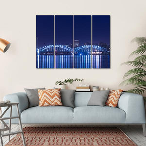 This canvas art features a serene view of a railway bridge spanning the Neva River, set against a tranquil city skyline. The inviting palette of blue, purple, and white captures the peaceful mood of a nighttime scene, enhanced by the soft reflections of lights on the water.