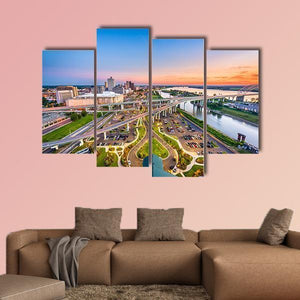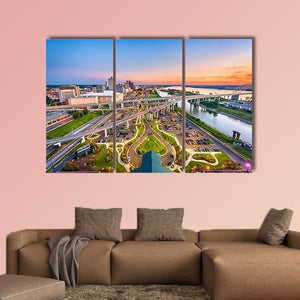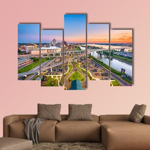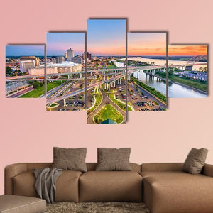Mud Island Aerial View Canvas shows an aerial cityscape with a river, bridge and a complex highway interchange beneath a sunset sky. The wide, modern composition uses blues, oranges, greens and greys for a vibrant, dynamic yet serene urban atmosphere. It fits well in contemporary living rooms or offices that favor modern city-themed wall decor.