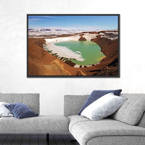 A panoramic view of Krafla Volcano in Iceland, capturing a turquoise crater lake within a volcanic landscape. Snow on the surrounding hills and distant mountains creates a vast, serene, and remote mood in a realistic nature-photography style that suits modern or nature-inspired rooms.