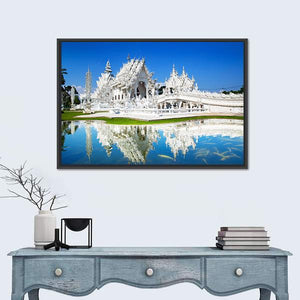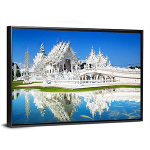 This artwork captures the serene beauty of Wat Rong Khun, a striking white temple in Chiang Rai. With its photorealistic detail, it features reflections in the pond and schools of fish under a clear blue sky, creating a peaceful ambiance ideal for any space.