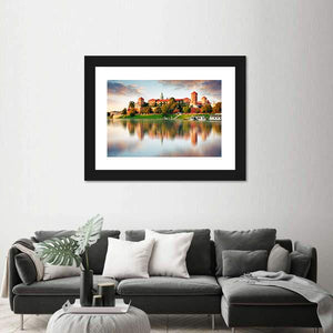 This panoramic canvas captures Wawel Hill and its castle in Krakow, showing ornate architecture reflected on calm river waters. Rendered in a realistic style and warmed by golden-hour greens, blues, and browns, it creates a serene, majestic atmosphere. It works well in modern living spaces as a peaceful landscape focal point.