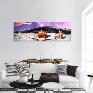 A panoramic scene of snowy Carpathian mountains with a warmly lit barn, shooting stars, and a person silhouetted in the snow. Soft pinks, purples and white give the image a magical, serene, and vast atmosphere with a dramatic, cinematic mood. This canvas pairs well with modern room decor as a striking wall piece.
