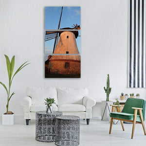 Windmill Under Blue Sky shows a windmill against a clear blue sky, seen from a low angle that highlights its stone masonry base and wooden blades. The vintage, rustic scene reads historic and serene, a tranquil landscape study. It suits nature-themed or vintage-style rooms as a calming wall artwork.
