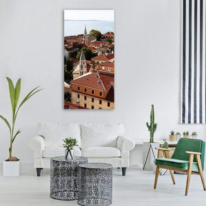 A high-angle view of Zadar in Croatia showing town architecture, red tiled roofs, a church steeple and distant water. The realistic landscape carries a sunny, serene architectural mood with warm oranges and cool blues. Suits modern or coastal room decor such as living rooms and entryways.