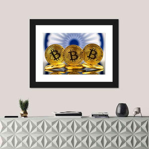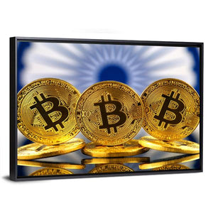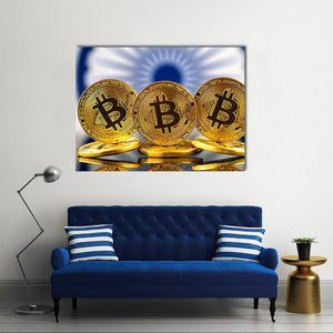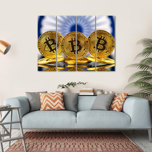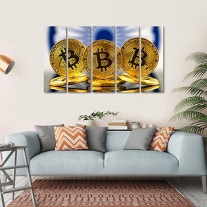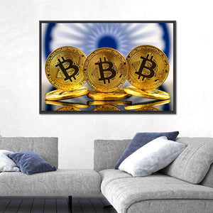 This eye-catching canvas features three gold bitcoin coins prominently displayed against a blurred blue and white circular background. The modern design evokes a financial vibe, making it an appealing choice for enthusiasts of cryptocurrency and contemporary decor.