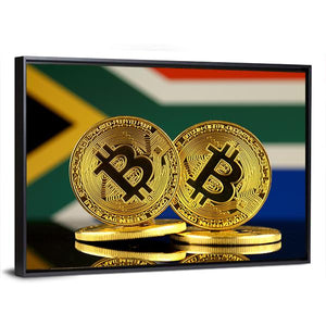 Celebrate the spirit of South Africa with this striking canvas art featuring two gleaming bitcoin coins against the vibrant backdrop of the South African flag. The modern and patriotic design blends financial symbolism with rich colors, making it an engaging piece for any contemporary space.