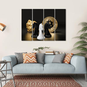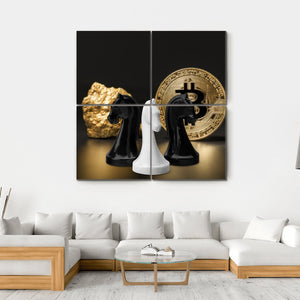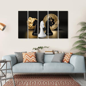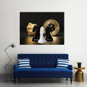 Featuring three chess knight pieces alongside a striking bitcoin coin and a gleaming gold nugget, this canvas wall art embodies a sophisticated and modern aesthetic. The luxurious palette of gold, black, and white effortlessly adds a touch of elegance to any space.