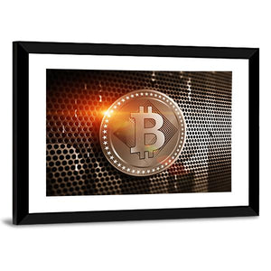 This panoramic canvas features the Bitcoin logo on a coin against a perforated metal background with a lens-flare highlight and a gold, bronze, black and orange palette. The symmetrical, modern-abstract image reads as a digital, financial piece and suits contemporary or technology-focused room decor.