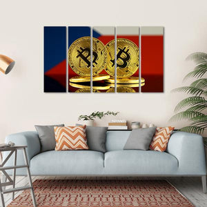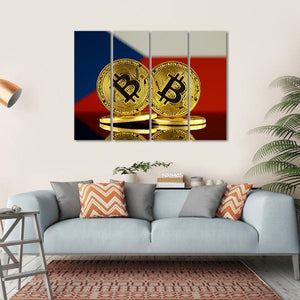 This canvas features two gold bitcoin coins stacked in front of the vibrant Czech Republic flag, a bold blend of red, white, and blue. Its modern design brings a professional touch, perfect for any tech-savvy space.