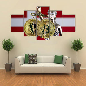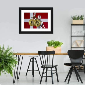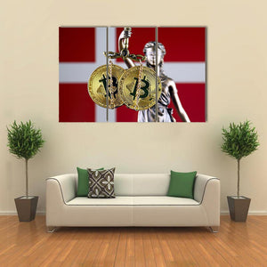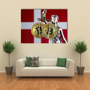 This canvas wall art features the Danish flag alongside a statue of Lady Justice, holding scales with gold Bitcoin coins. It exudes a symbolic and significant atmosphere, making it a striking addition to any modern decor.